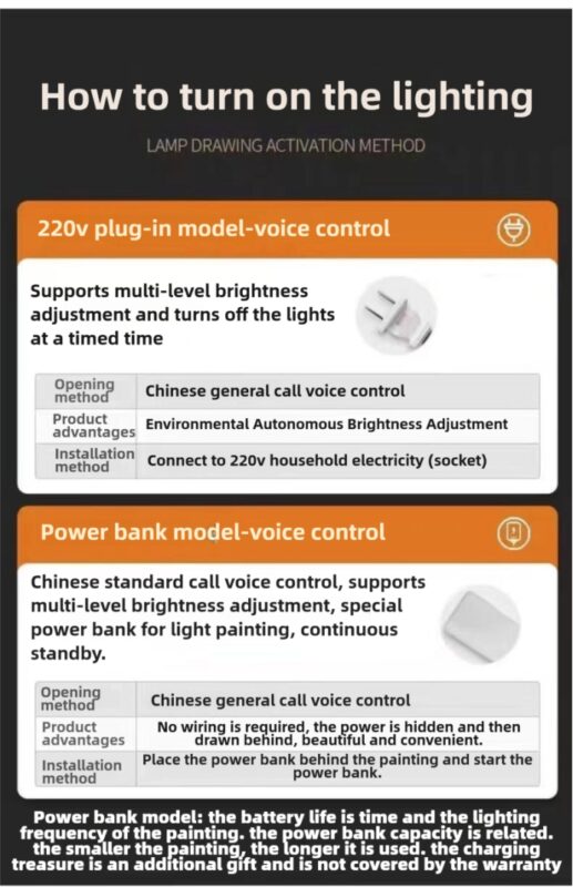 A2: Our Voice Control function supports basic Chinese commands like “打开画 (Open the painting)”, “关灯 (Turn off the light)”, “亮一点 (Brighter)”, “暗一点 (Dimmer)” for controlling power and adjusting brightness. This feature uses local offline recognition technology and does NOT require a Wi-Fi network connection. It responds directly to spoken commands, offering quick response and better privacy.