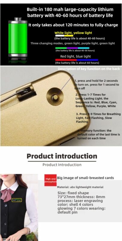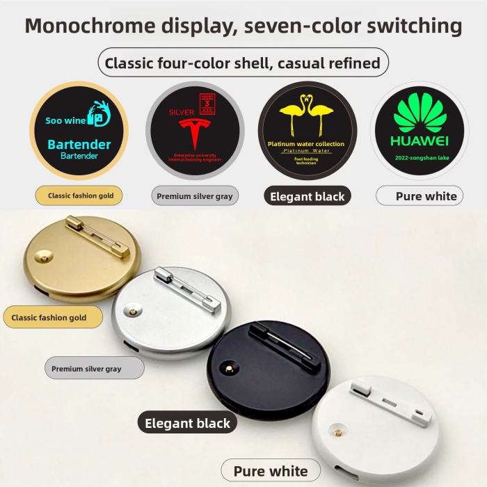 Visual impact is another standout feature. It comes with LEDs capable of displaying 7 colors, and users can easily switch between static and flashing modes via a simple button. From calm white to passionate red, from vibrant blue to romantic purple, this multi-color light up badge can instantly adapt to any event theme and brand color, becoming a magnet for attention.